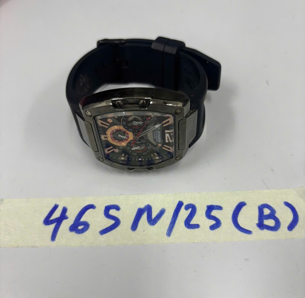Ngày tiếp nhận: 10/03/2025 Mã hồ sơ: 465N2025B Mô tả: 01 đồng hồ màu đen có chữ D-ZINER, dây đeo cao su màu đen. |