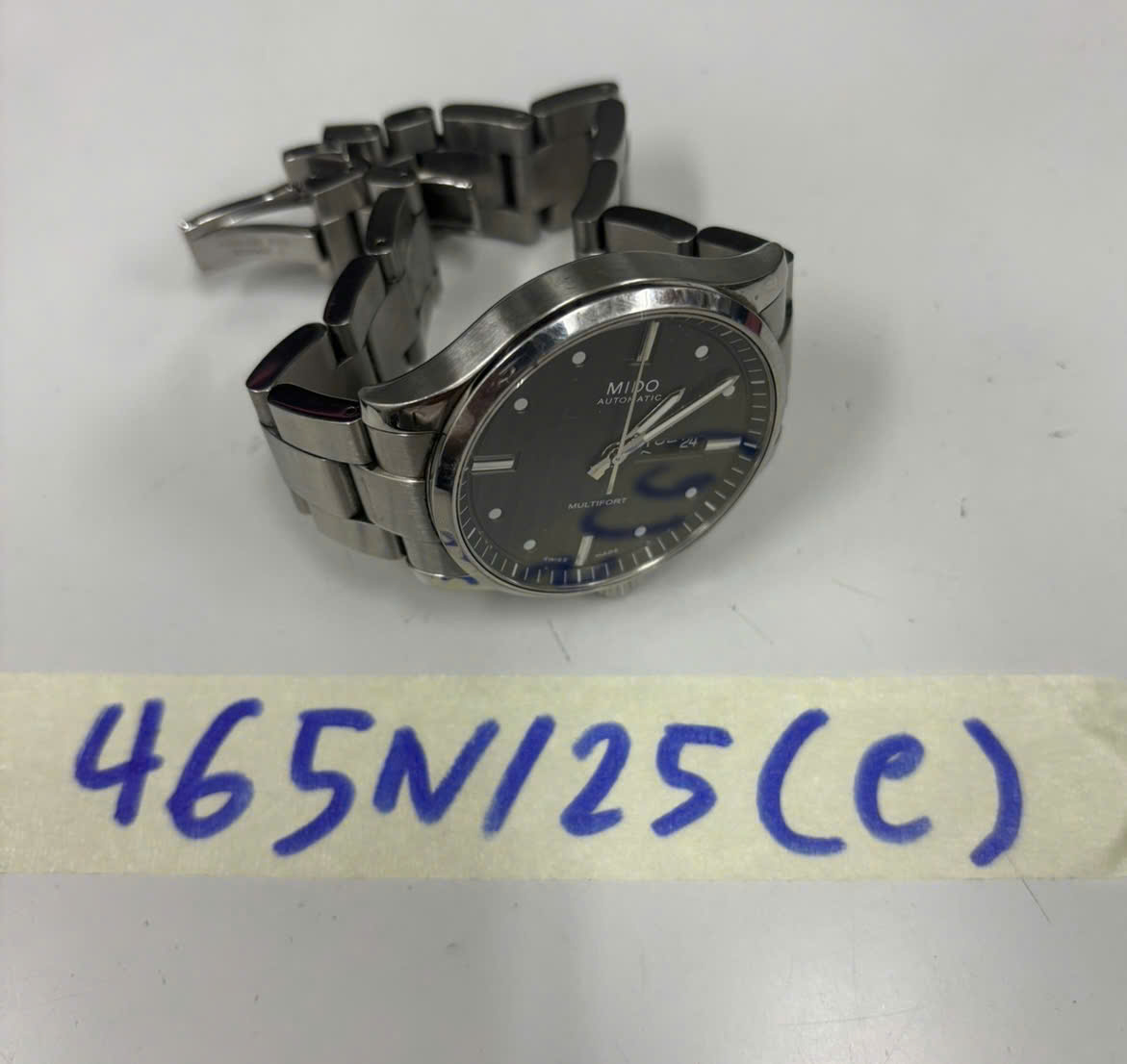 Ngày tiếp nhận: 10/03/2025 Mã hồ sơ: 465N2025C Mô tả: 01 đồng hồ mặt hình tròn màu đen viền trắng có chữ MIDO, dây đeo kim loại màu trắng. |
