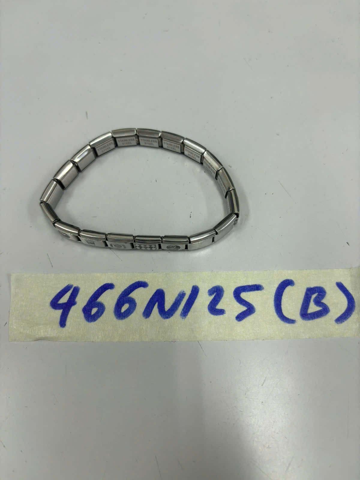 Ngày tiếp nhận: 10/03/2025 Mã hồ sơ: 466N2025B Mô tả: 01 vòng tay kim loại bên trong có chữ "STAINLESS STEEL". |
