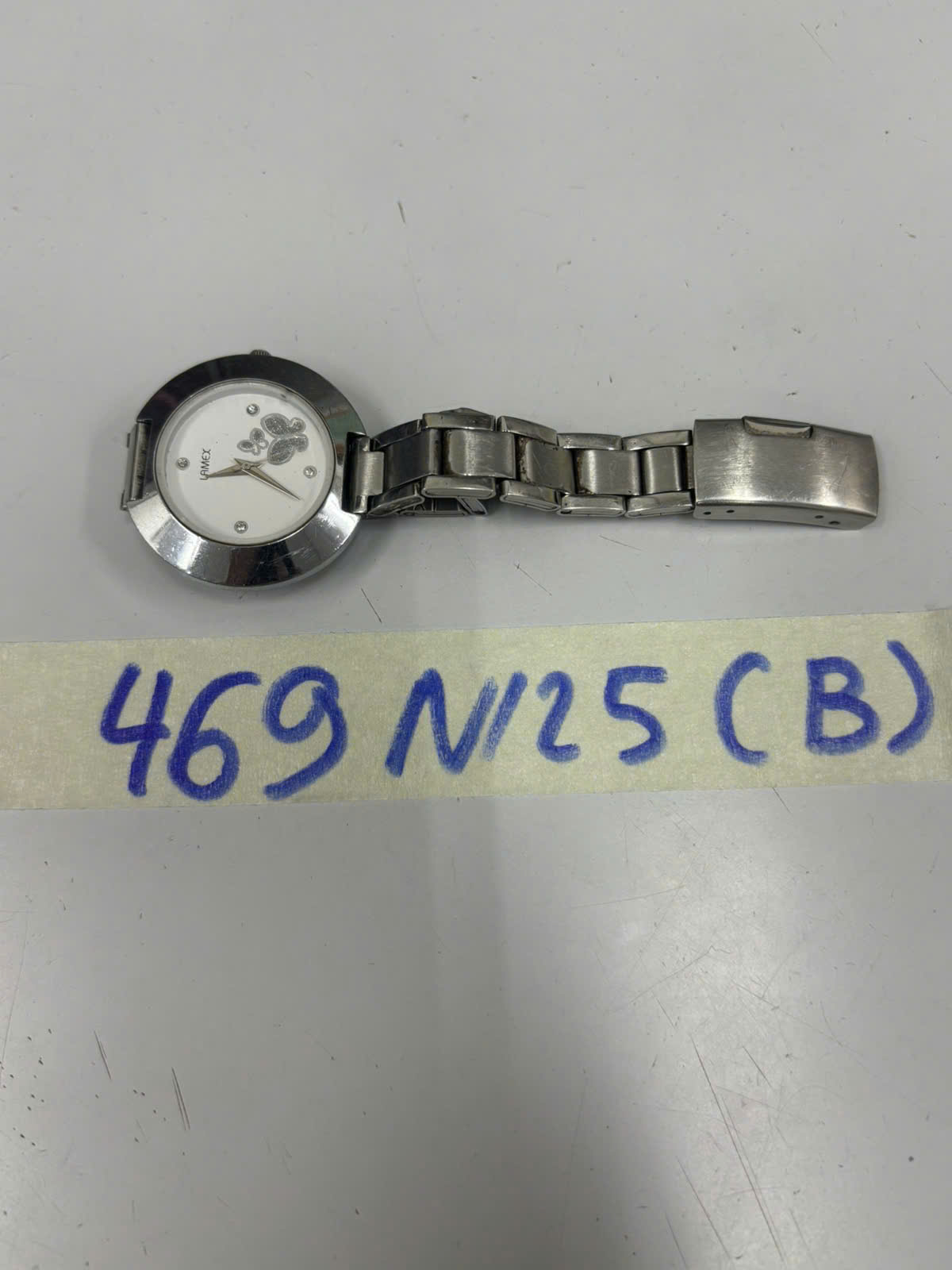 Ngày tiếp nhận: 10/03/2025 Mã hồ sơ: 469N2025B Mô tả: 01 đồng hồ mặt hình tròn màu trắng có chữ LAMEX, dây đeo kim loại màu trắng. |