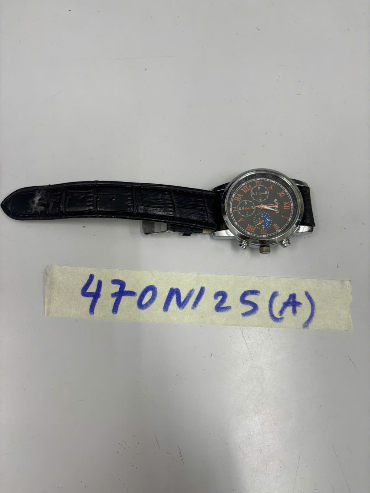 Ngày tiếp nhận: 10/03/2025 Mã hồ sơ: 469N2025A Mô tả: 01 đồng hồ mặt hình tròn màu vàng có chữ FUXIANG QUARTZ, dây đeo da màu đen. |