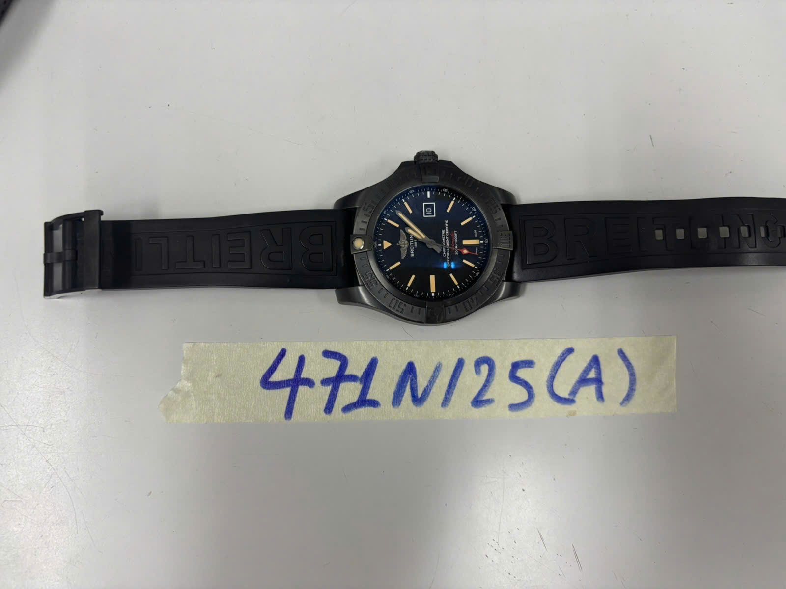 Ngày tiếp nhận: 10/03/2025 Mã hồ sơ: 471N2025A Mô tả: 01 đồng hồ màu đen có chữ "Breitling", dây cao su có chữ "Breitling". |