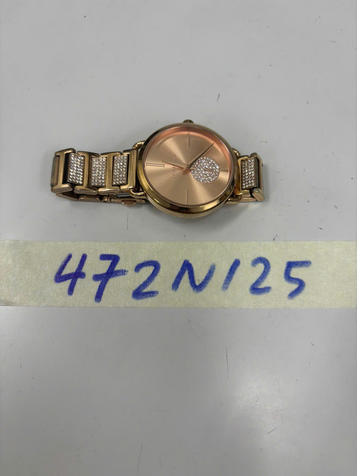 Ngày tiếp nhận: 10/03/2025 Mã hồ sơ: 472N2025 Mô tả: 01 đồng hồ bằng kim loại màu vàng, mặt đồng hồ hình tròn có logo chữ "MICHAEL KORS" đã qua sử dụng. |