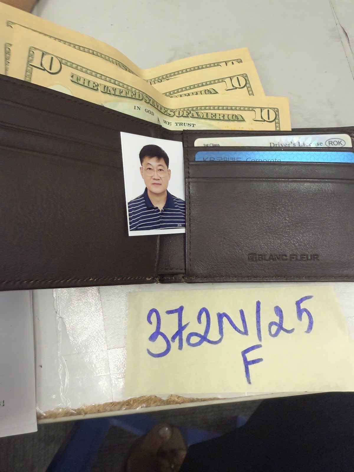 Ngày tiếp nhận: 21/02/2025 Mã hồ sơ: 372N2025F Mô tả: 01 Ví da màu nâu BlancFluer bên trong có 03 tờ tiền 10USD (tổng giá trị 30USĐ), 01 GPTX mang tên Youn Yeong Su, 01 Thẻ Visa mang tên SEANUL. |