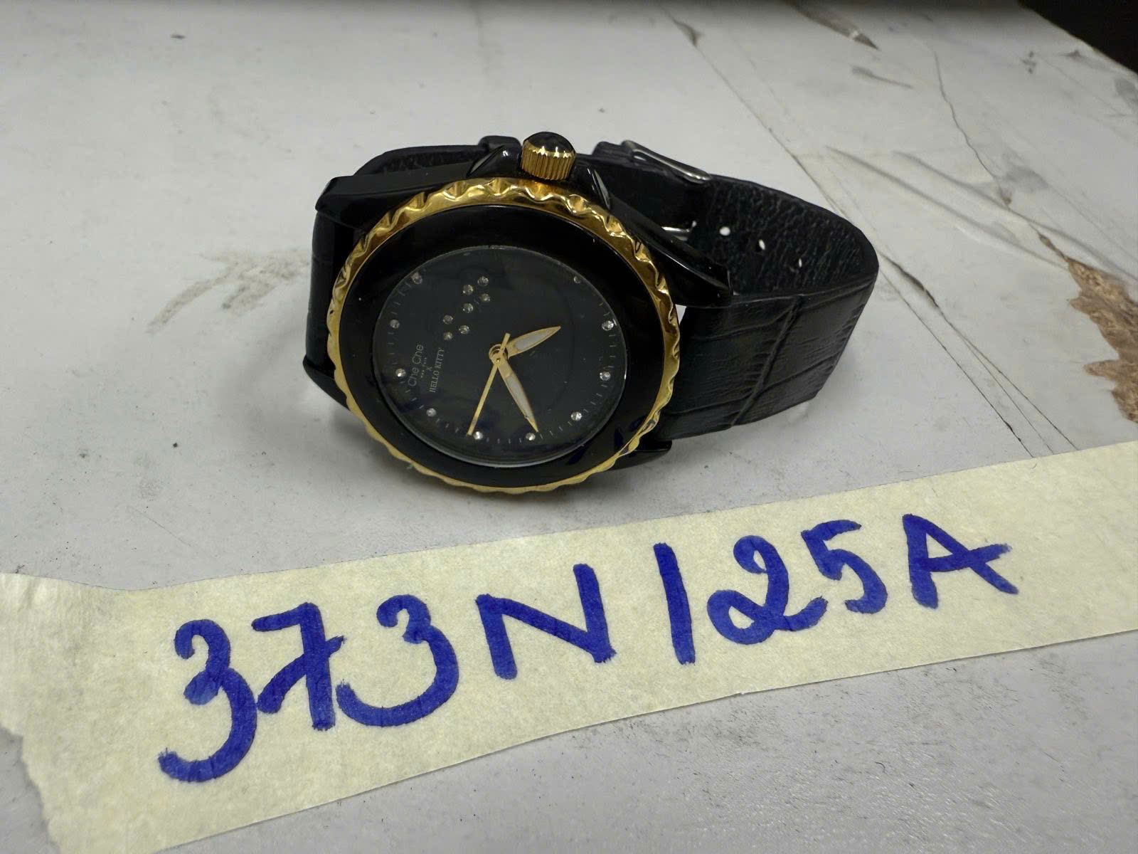Ngày tiếp nhận: 21/02/2025 Mã hồ sơ: 373N2025A Mô tả: 01 đồng hồ điện tử màu đen có chữ "CHE CHE X HELLO KITTY" dây giống da màu đen. |