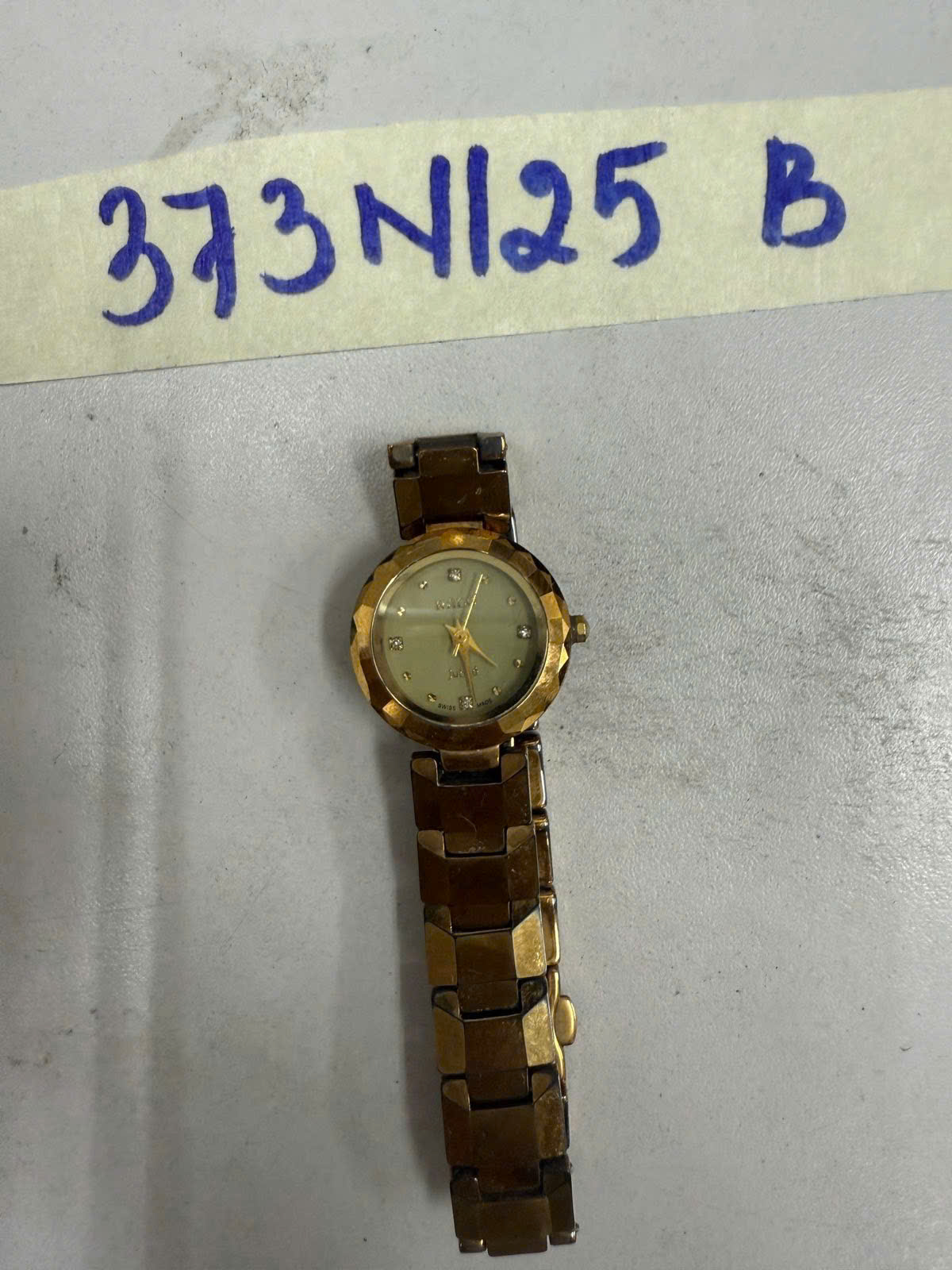 Ngày tiếp nhận: 21/02/2025 Mã hồ sơ: 373N2025B Mô tả: 01 đồng hồ kim loai màu vàng, mặt đồng hồ hình tròn có logo chữ RADO. |