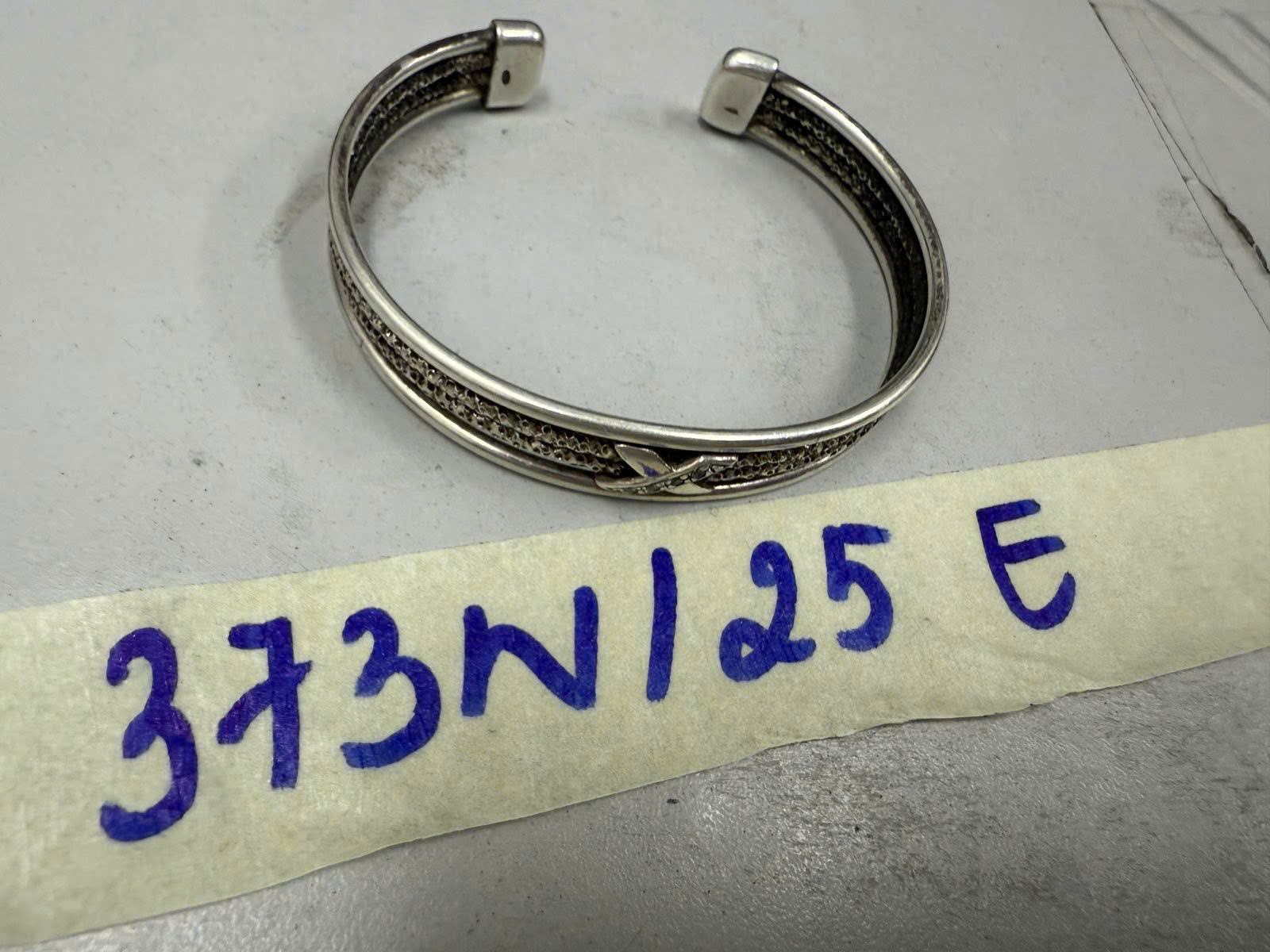 Ngày tiếp nhận: 21/02/2025 Mã hồ sơ: 373N2025E Mô tả: 01 lắc tay kim loại màu bạc có đính hạt, trên mặt có chữ "X". |
