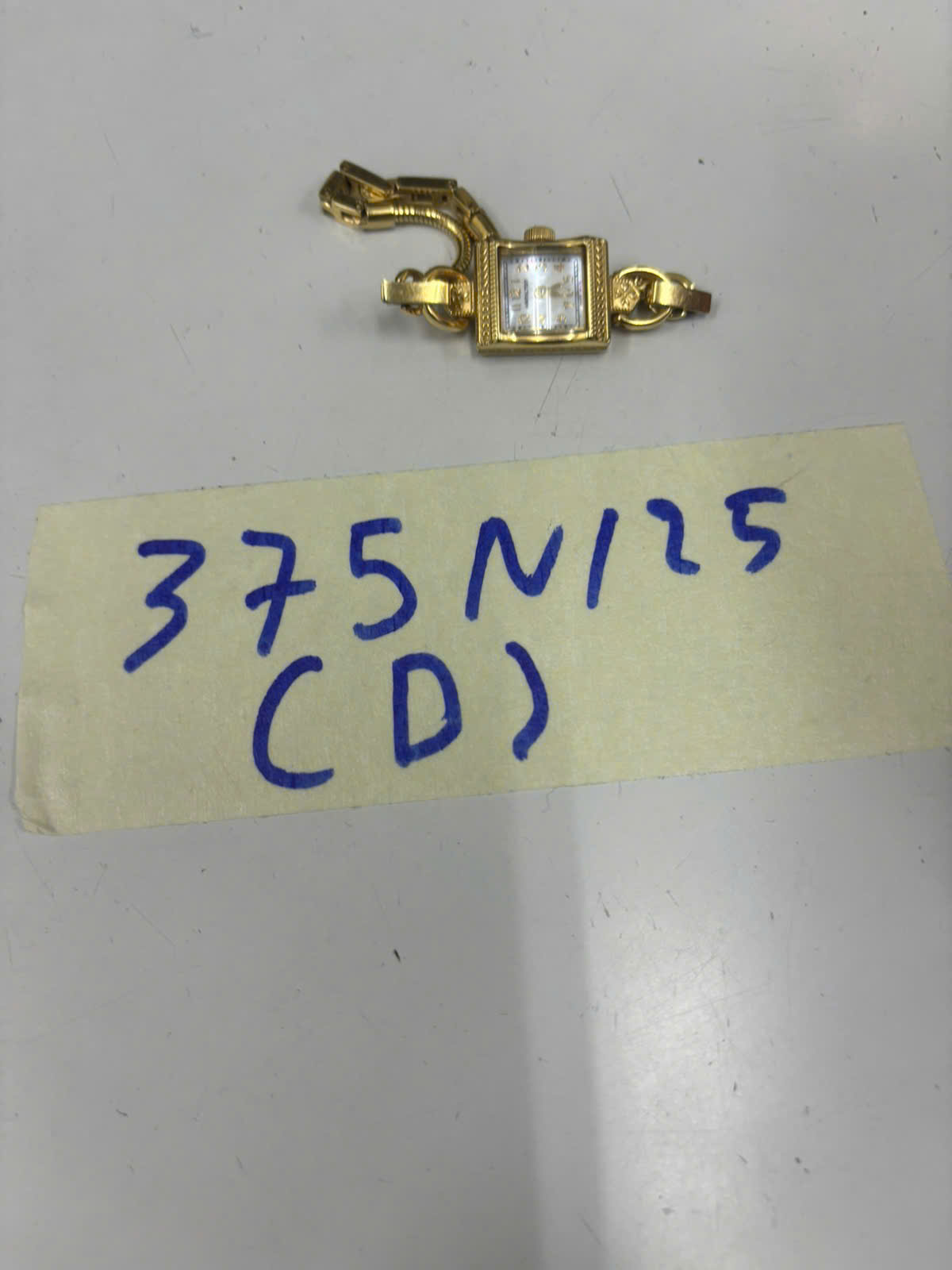 Ngày tiếp nhận: 21/02/2025 Mã hồ sơ: 375N2025D Mô tả: 01 Đồng hồ kim loại có màu vàng, mặt đồng hồ hình vuông có chữ "HAMILTON". |