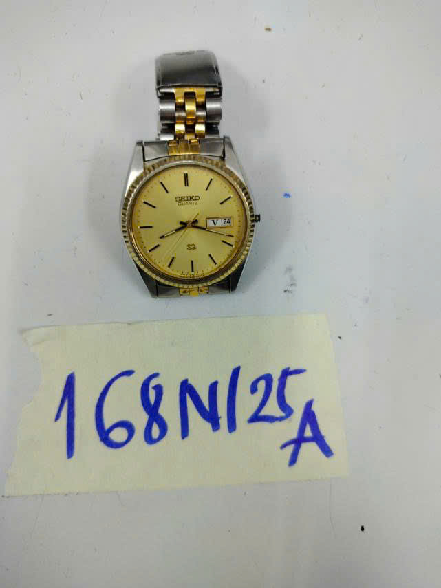 Ngày tiếp nhận: 24/01/2025 Mã hồ sơ: 168N2025A Mô tả: 01 đồng hồ màu vàng/ trắng có chữ "Seiko", dây kim loại màu vàng trắng. |