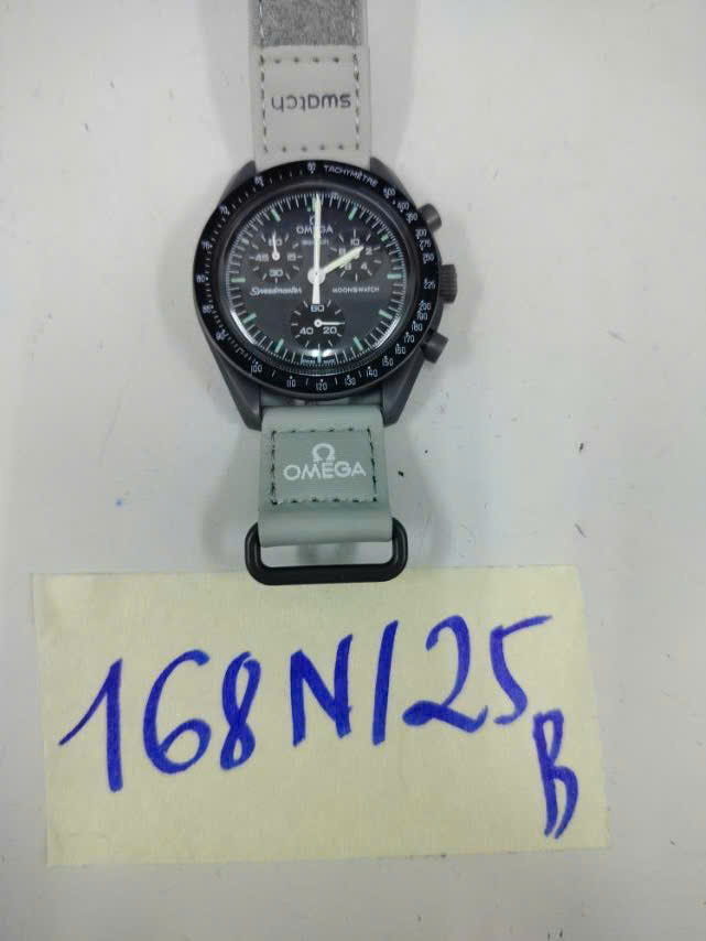 Ngày tiếp nhận: 24/01/2025 Mã hồ sơ: 168N2025B Mô tả: 01 đồng hồ màu xám có chữ "Omega x Swatch", dây vải màu xám. |