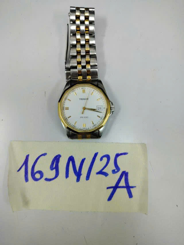 Ngày tiếp nhận: 24/01/2025 Mã hồ sơ: 169N2025A Mô tả: 01 đồng hồ màu vàng/ trắng có chữ "Tissot". |
