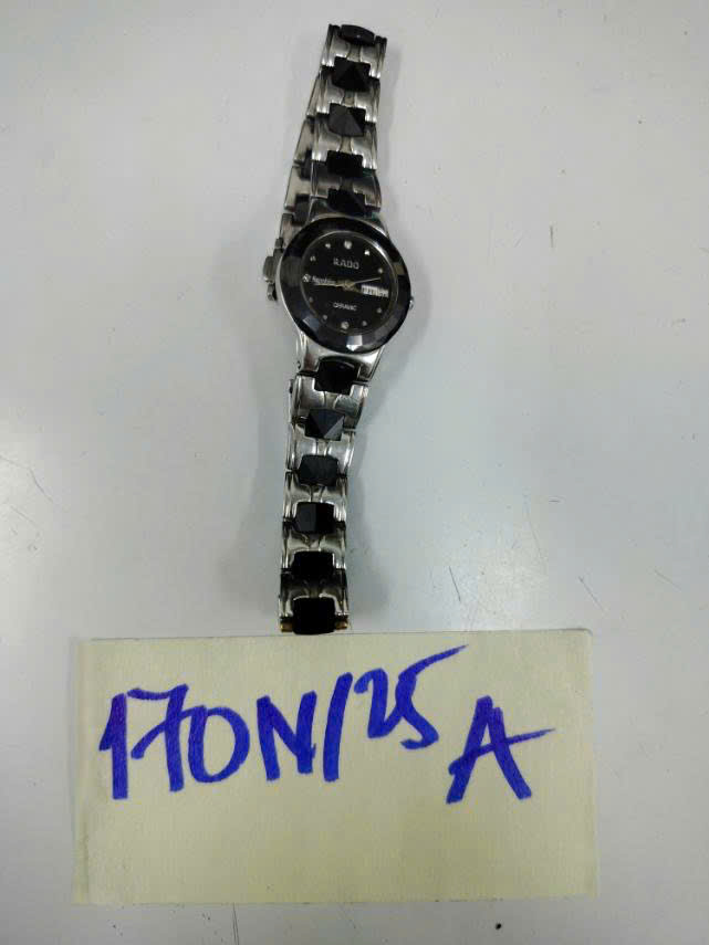 Ngày tiếp nhận: 24/01/2025 Mã hồ sơ: 170N2025A Mô tả: 01 đồng hồ bằng kim loại màu trắng, mặt hình tròn có logo chữ "RADO". |