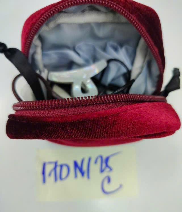 Ngày tiếp nhận: 24/01/2025 Mã hồ sơ: 170N2025C Mô tả: 01 túi vải màu đỏ thêu chữ "Beauty", bên trong gồm: 03 cặp bông tai, 02 dây kim loại màu vàng, 01 dây da có đá màu trắng, 01 dây da có đá màu tím, 01 kẹp tóc. |