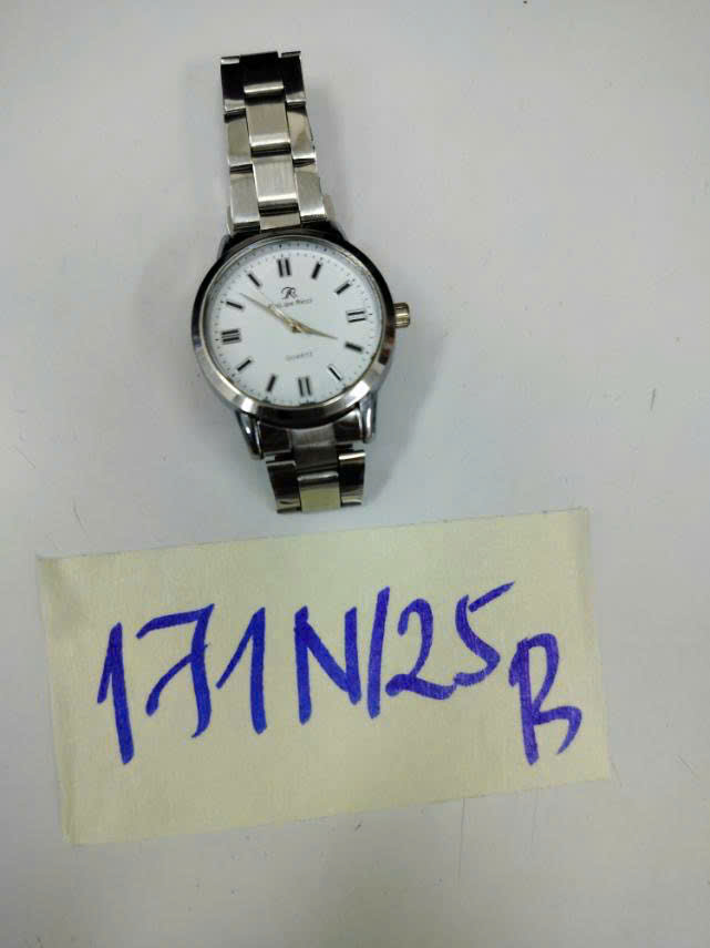 Ngày tiếp nhận: 24/01/2025 Mã hồ sơ: 171N2025B Mô tả: 01 đồng hồ mặt tròn màu trắng (xám) có chữ "PhiLipe Ricci", dây kim loại màu xám. |