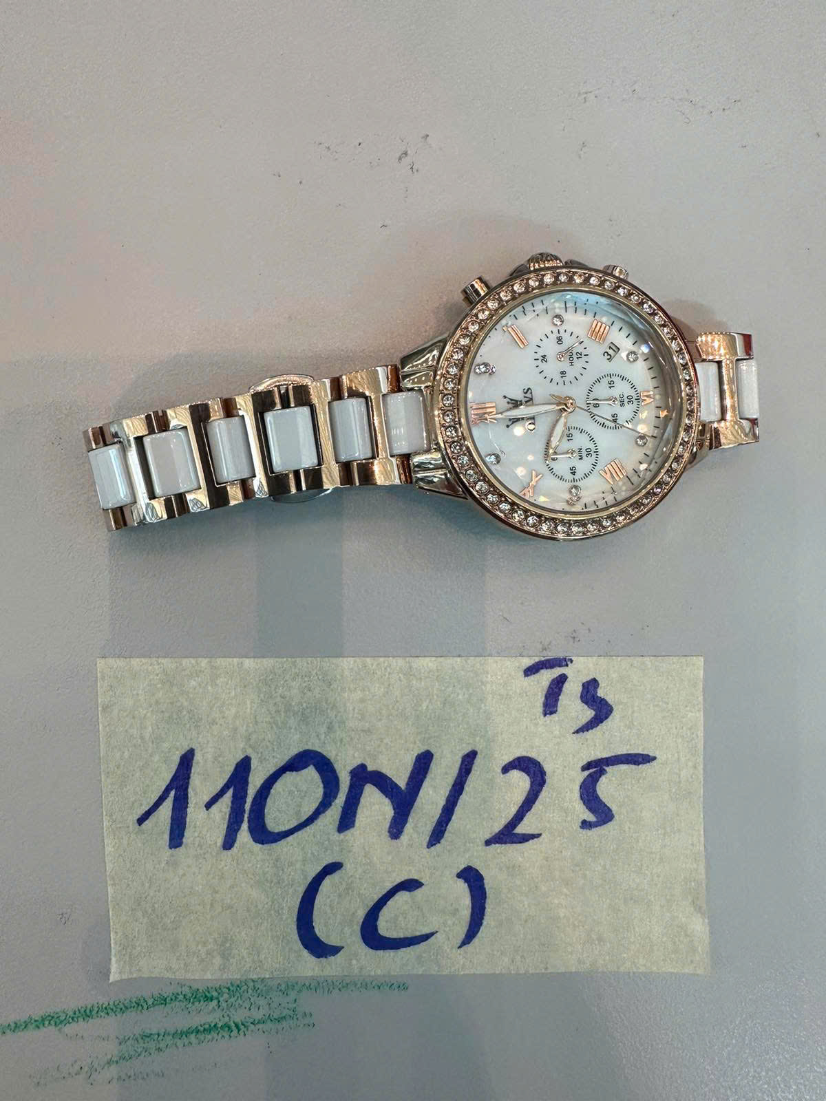 Ngày tiếp nhận: 01/12/2025 Mã hồ sơ: 110N2025C Mô tả: 01 Đồng hồ kim loại màu trắng vàng,mặt tròn có đính đá,trên mặt đồng hồ có chữ OLEUS. |