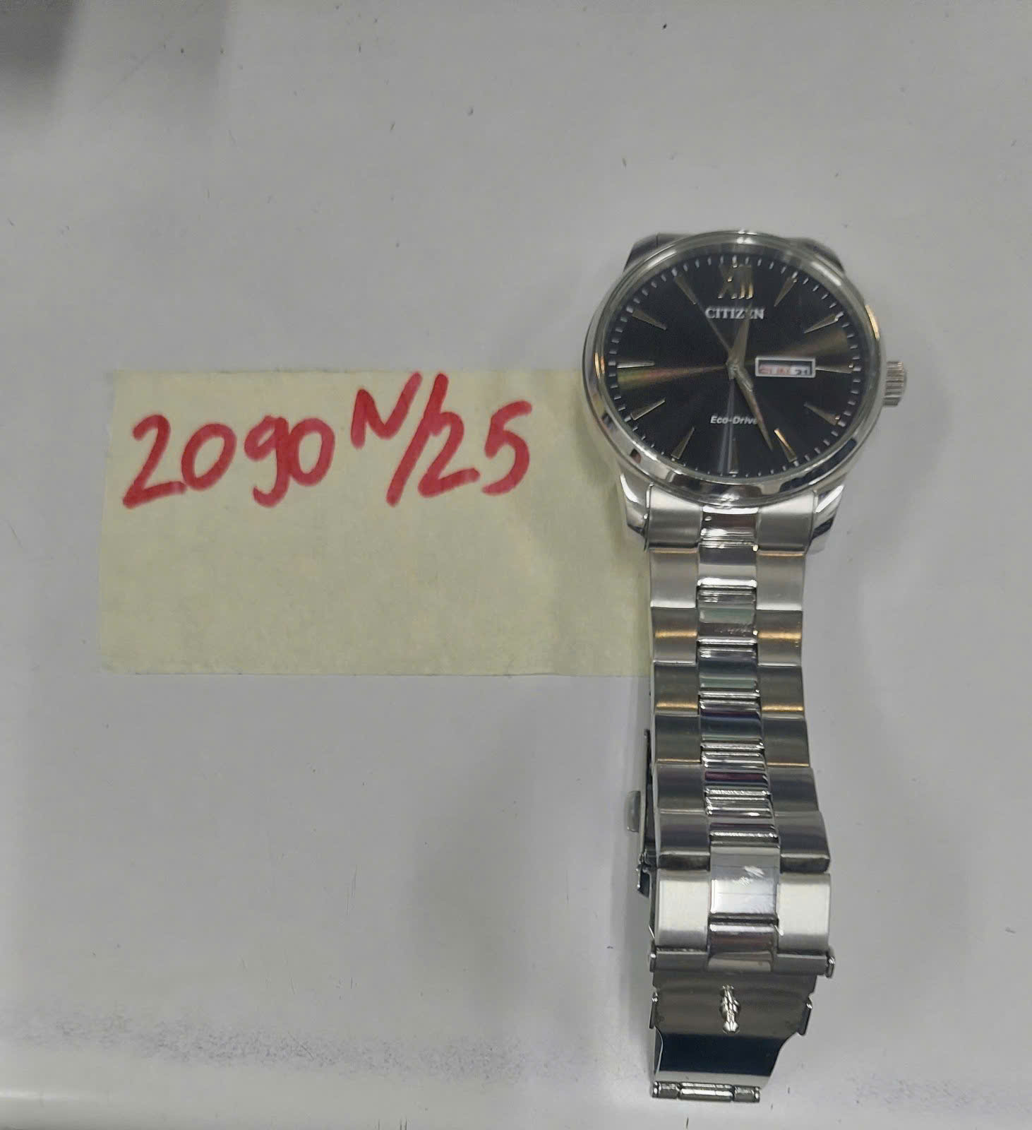 Ngày tiếp nhận: 30/11/2025 Mã hồ sơ: 2090N2025 Mô tả: 01 đồng hồ mặt hình tròn màu đen có chữ CITIZEN, dây đeo kim loại màu trắng. |