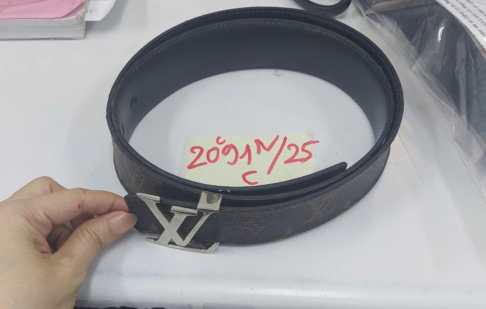 Ngày tiếp nhận: 30/11/2025 Mã hồ sơ: 2091N2025C Mô tả: 01 thắt lưng da màu nâu có chữ "LV" bằng kim loại. |