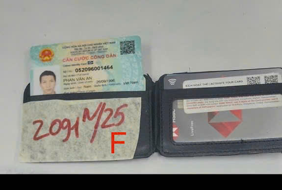 Ngày tiếp nhận: 30/11/2025 Mã hồ sơ: 2091N2025F Mô tả: 01 ví da magsafe màu đen có chữ "ESR", bên trong có Căn cước công dân, Giấy phép lái xe, Thẻ ngân hàng HSBC mang tên PHAN VĂN AN. |