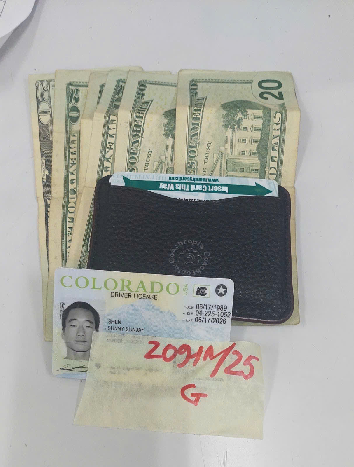 Ngày tiếp nhận: 30/11/2025 Mã hồ sơ: 2091N2025G Mô tả: 01 ví da màu đen có chữ "C", bên trọng có 120USD (06 tờ mệnh giá 20USD), Giấy phép lái xe mang tên SHEN SUNNY SUNJAY. |