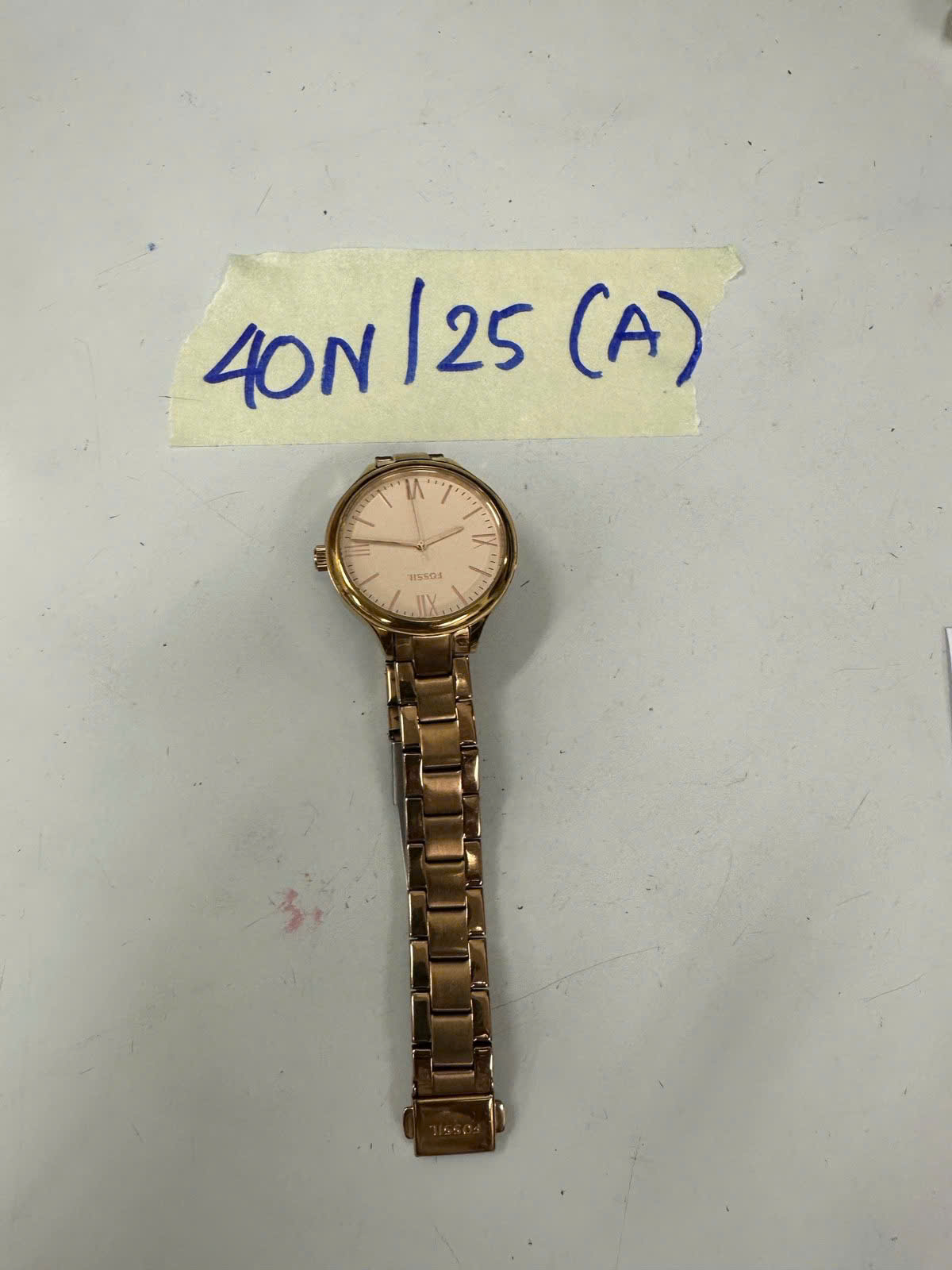 Ngày tiếp nhận: 07/01/2025 Mã hồ sơ: 40N2025A Mô tả: 01 đồng hồ mặt hình tròn có chữ FOSSIL, viền màu vàng đồng, dây đeo kim nai màu vàng đồng. |