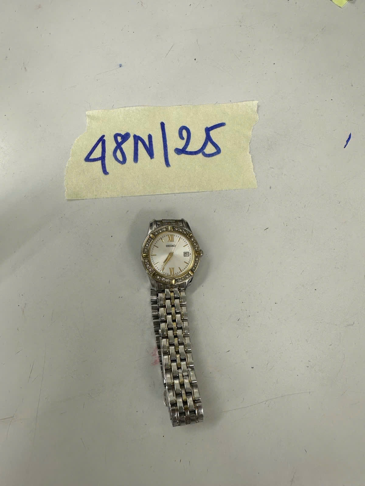 Ngày tiếp nhận: 07/01/2025 Mã hồ sơ: 48N2025 Mô tả: 01 đồng hồ đeo tay bằng kim loại màu trắng, mặt đồng hồ hình tròn có logo chữ "SEIKO". |