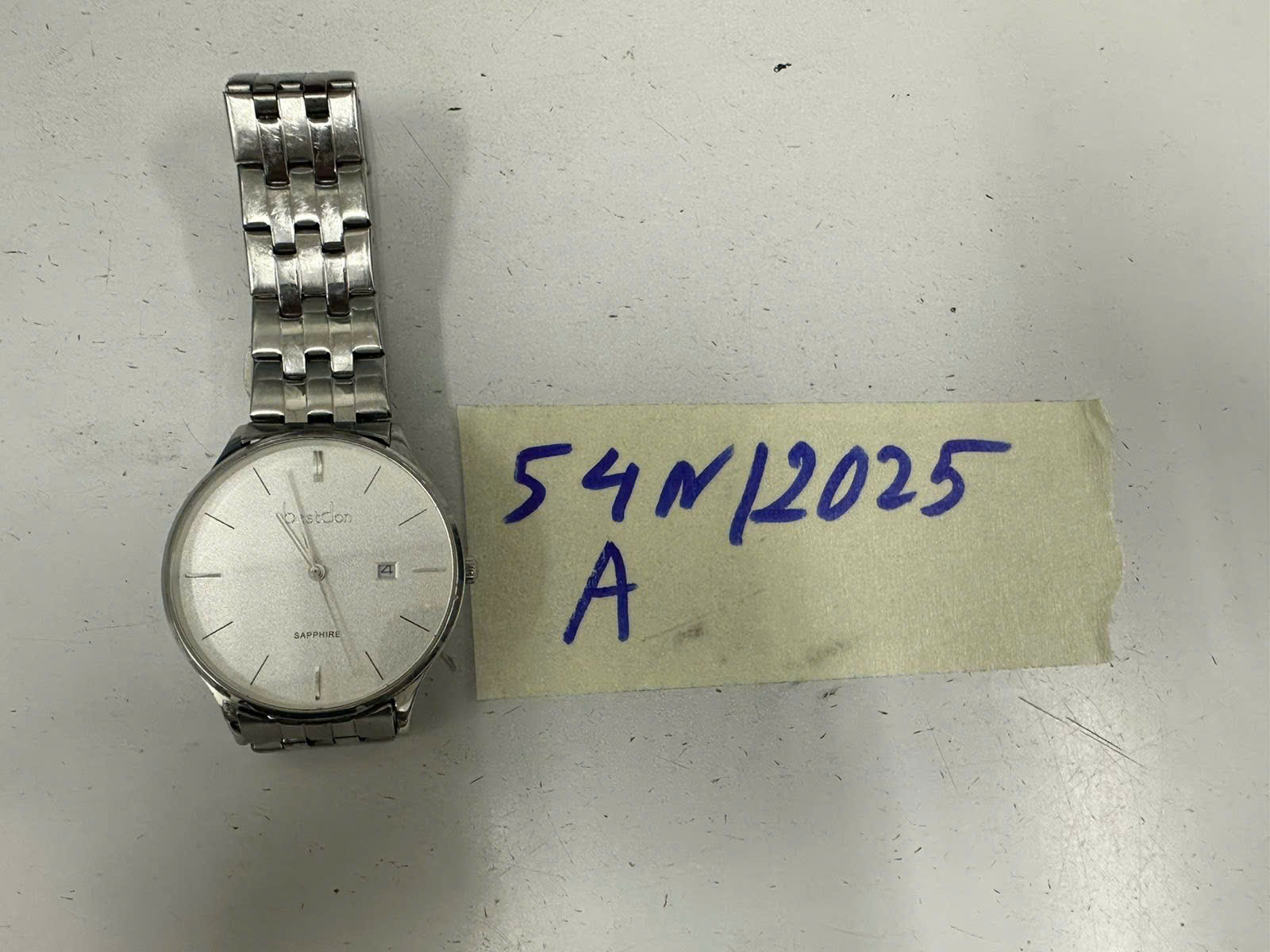 Ngày tiếp nhận: 08/01/2025 Mã hồ sơ: 54N2025A Mô tả: 01 đồng hồ dây kim loại màu trắng, mặt tròn có chữ "Bestdon". |