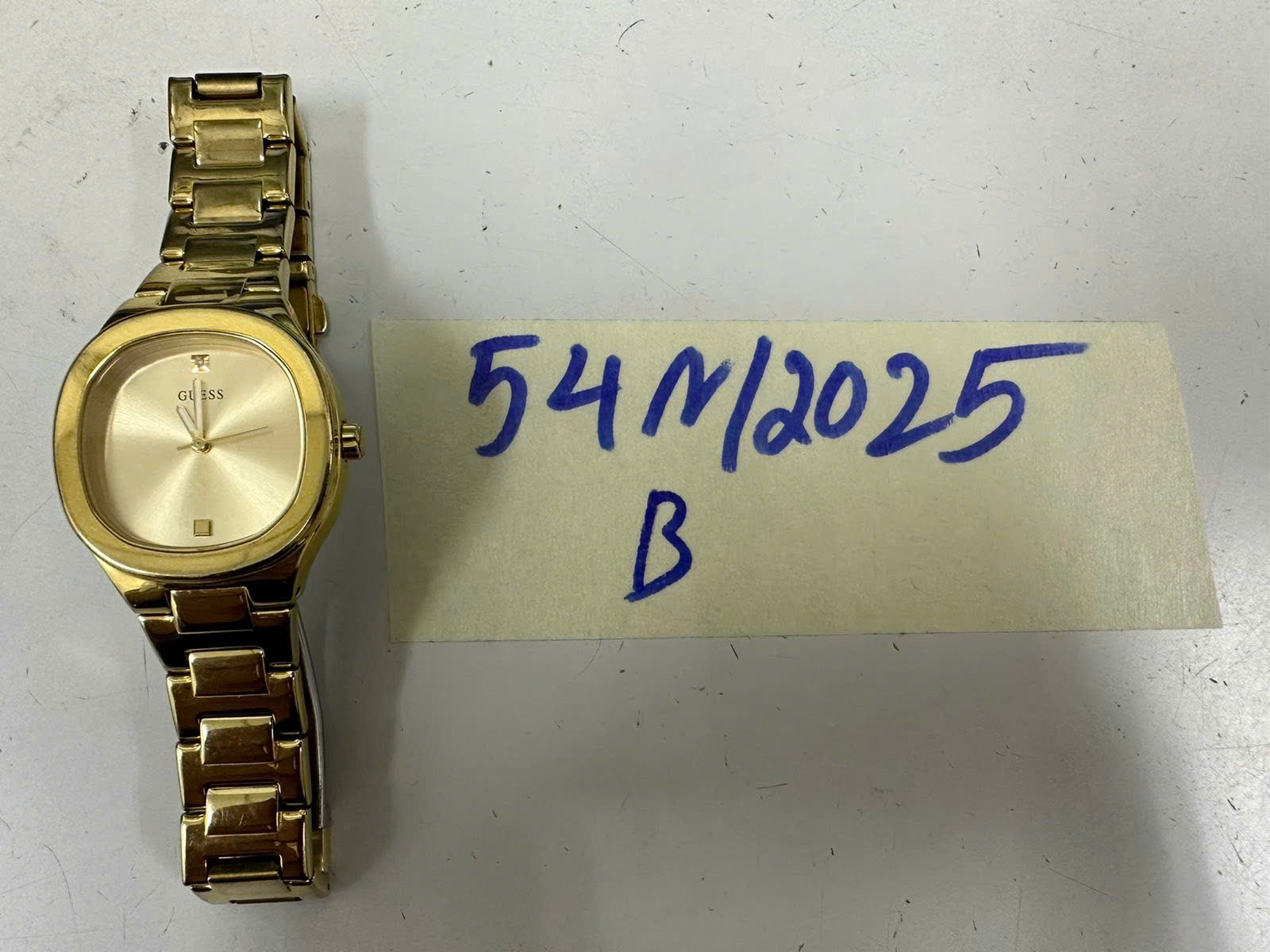 Ngày tiếp nhận: 08/01/2025 Mã hồ sơ: 54N2025B Mô tả: 01 đồng hồ dây kim loại màu vàng, mặt có chữ "Guess". |