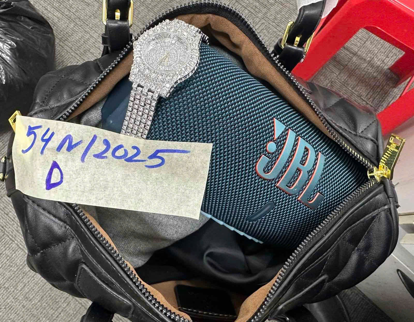 Ngày tiếp nhận: 08/01/2025 Mã hồ sơ: 54N2025D Mô tả: 01 túi xách da màu đen, bên trong có 01 đồng hồ dây kim loại có đính đá sau lưng có ghi chữ "Chopard" và 01 loa có chữ JBL và đồ dùng cá nhân. |