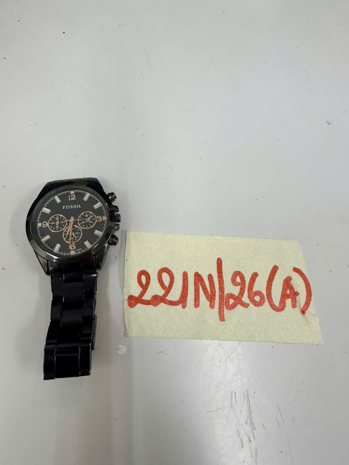 Ngày tiếp nhận: 07/02/2026 Mã hồ sơ: 221N2026A Mô tả: 01 đồng hồ màu đen, mặt tròn có chữ FOSSIL, dây kim loại màu đen. |