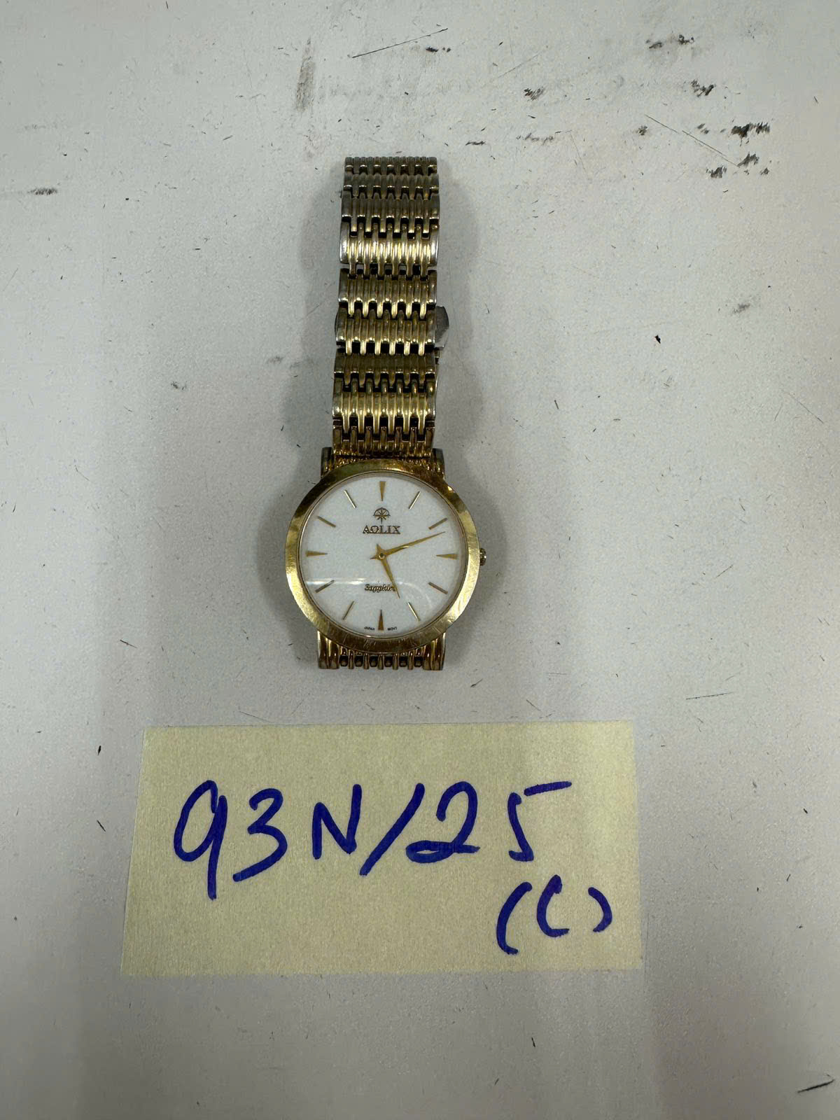 Ngày tiếp nhận: 14/01/2025 Mã hồ sơ: 93N2025C Mô tả: 01 đồng hồ màu vàng có dây đeo màu vàng, đăng sau có chữ "AOLIX". |
