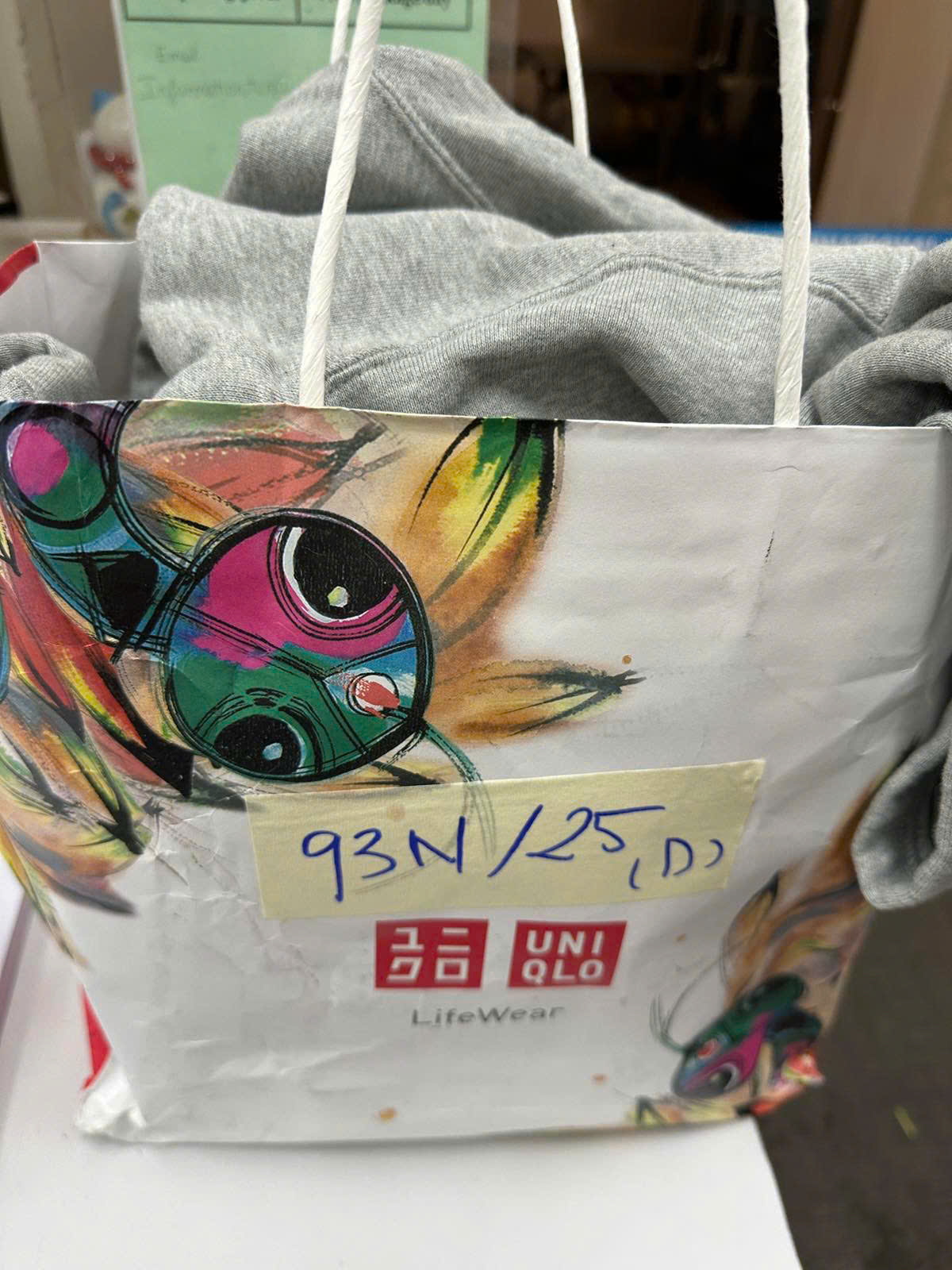 Ngày tiếp nhận: 14/01/2025 Mã hồ sơ: 93N2025D Mô tả: 01 túi giấy màu trắng có chữ UNIQLO có: 02 áo màu xám, 01 túi nữ màu trắng. |