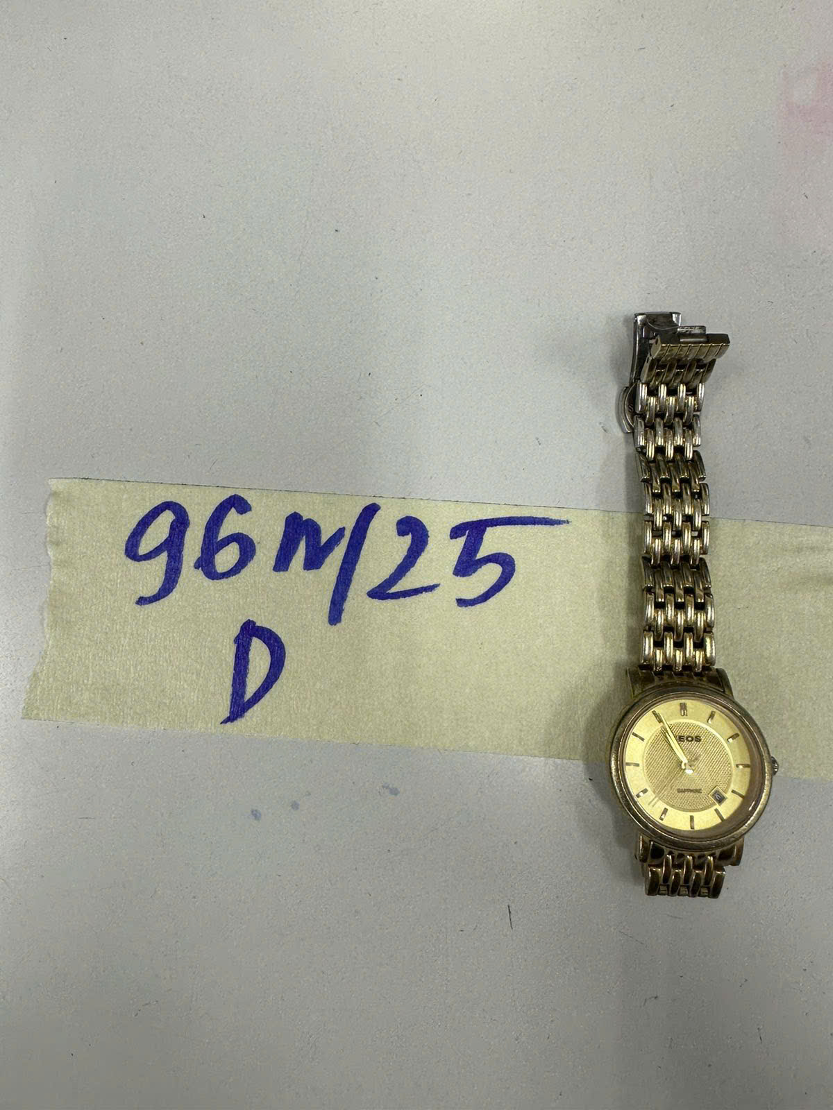 Ngày tiếp nhận: 14/01/2025 Mã hồ sơ: 96N2025D Mô tả: 01 đồng hồ kim loại màu vàng hiệu Neos. |
