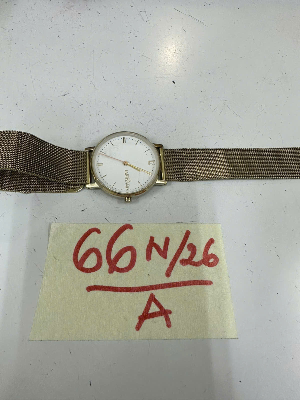 Ngày tiếp nhận: 15/01/2026 Mã hồ sơ: 66N2026A Mô tả: 01 đồng hồ dây kim loại màu vàng hiệu LES PARTISANES. |