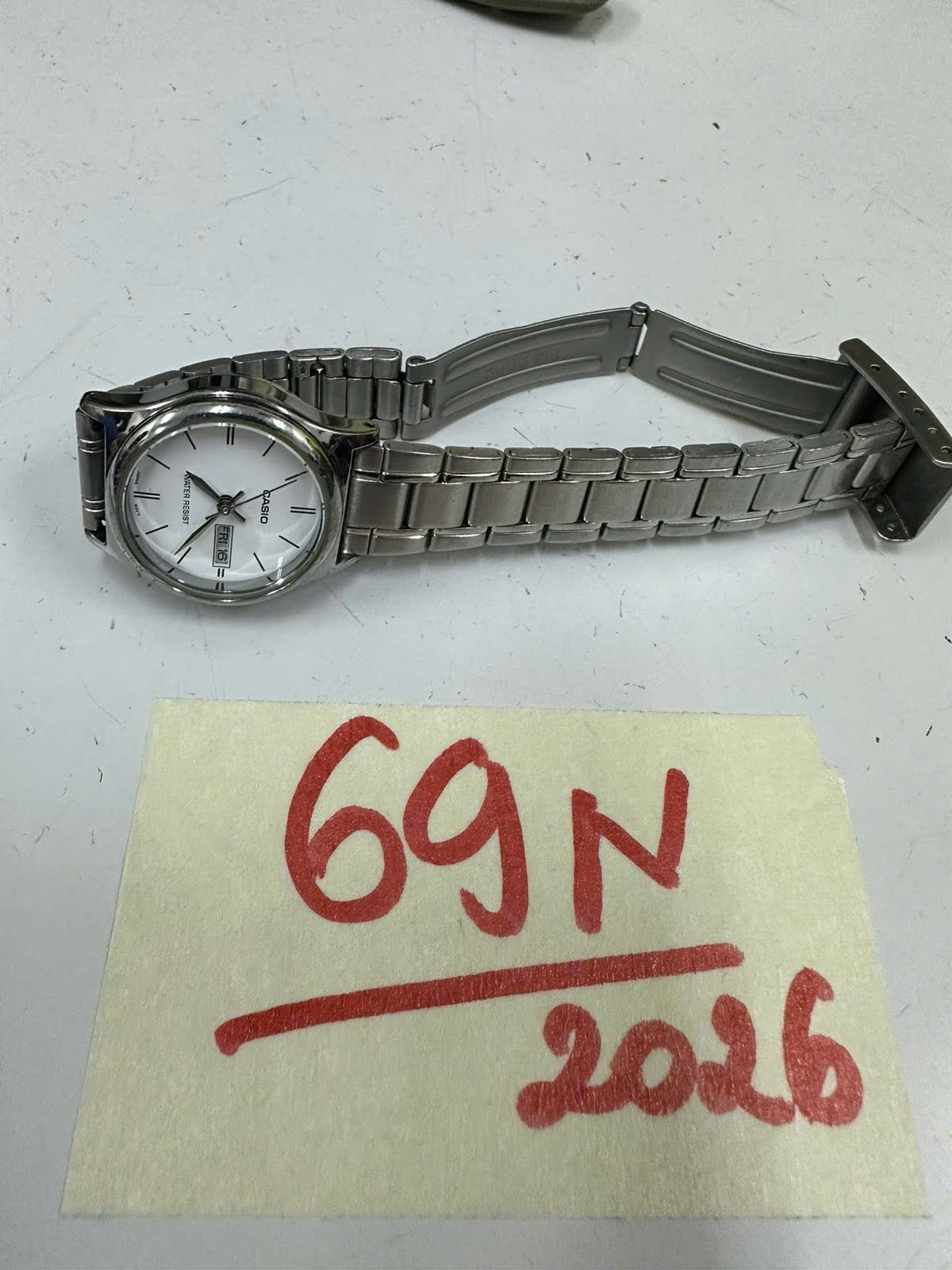 Ngày tiếp nhận: 15/01/2026 Mã hồ sơ: 69N2026 Mô tả: 01 đồng hồ mặt tròn dây kim loại màu trắng có chữ CASIO. |