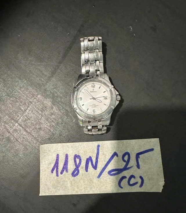 Ngày tiếp nhận: 17/01/2025 Mã hồ sơ: 118N2025A Mô tả: 01 đồng hồ mặt tròn, dây kim loại màu bạc, có chữ "FESTINA SATM WATER RESIST QUART. |