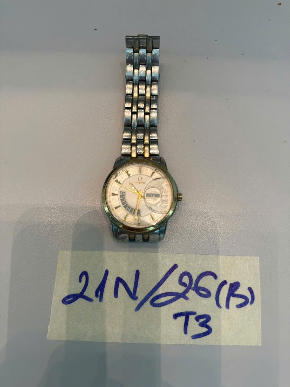 Ngày tiếp nhận: 16/01/2026 Mã hồ sơ: 21N2026B-T3 Mô tả: 01 đồng hồ kim loại hiệu OMEGA. |