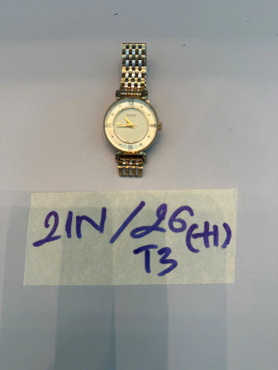 Ngày tiếp nhận: 16/01/2026 Mã hồ sơ: 21N2026H-T3 Mô tả: 01 đồng hồ đeo tay kim loại màu vàng, có ghi chữ JULIUS. |