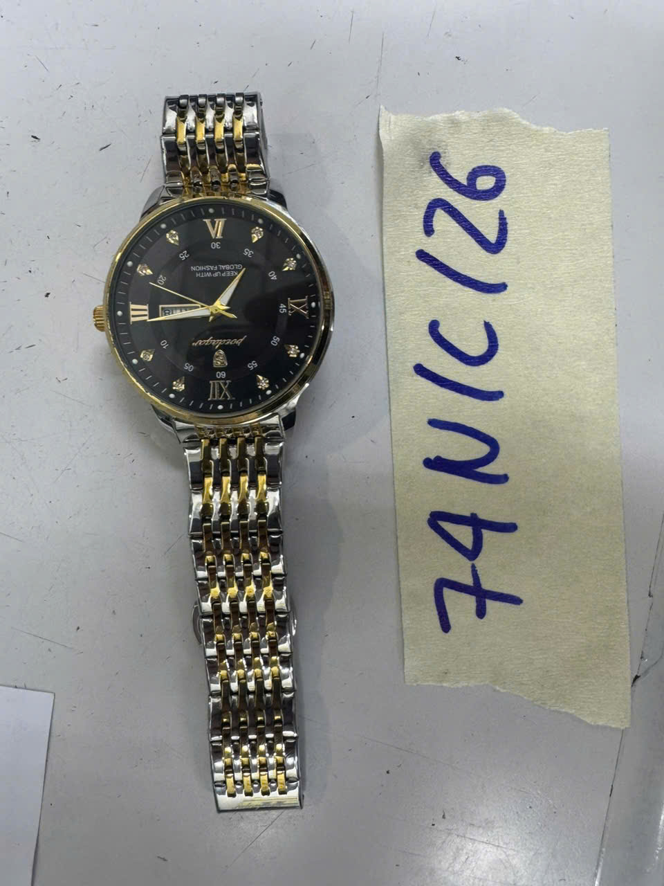Ngày tiếp nhận: 16/01/2026 Mã hồ sơ: 74N2026C Mô tả: 01 đồng hồ mặt hình tròn màu đen, viền vàng, có chữ POEDAGAR, dây đeo kim loại 2 màu vàng - trắng. |