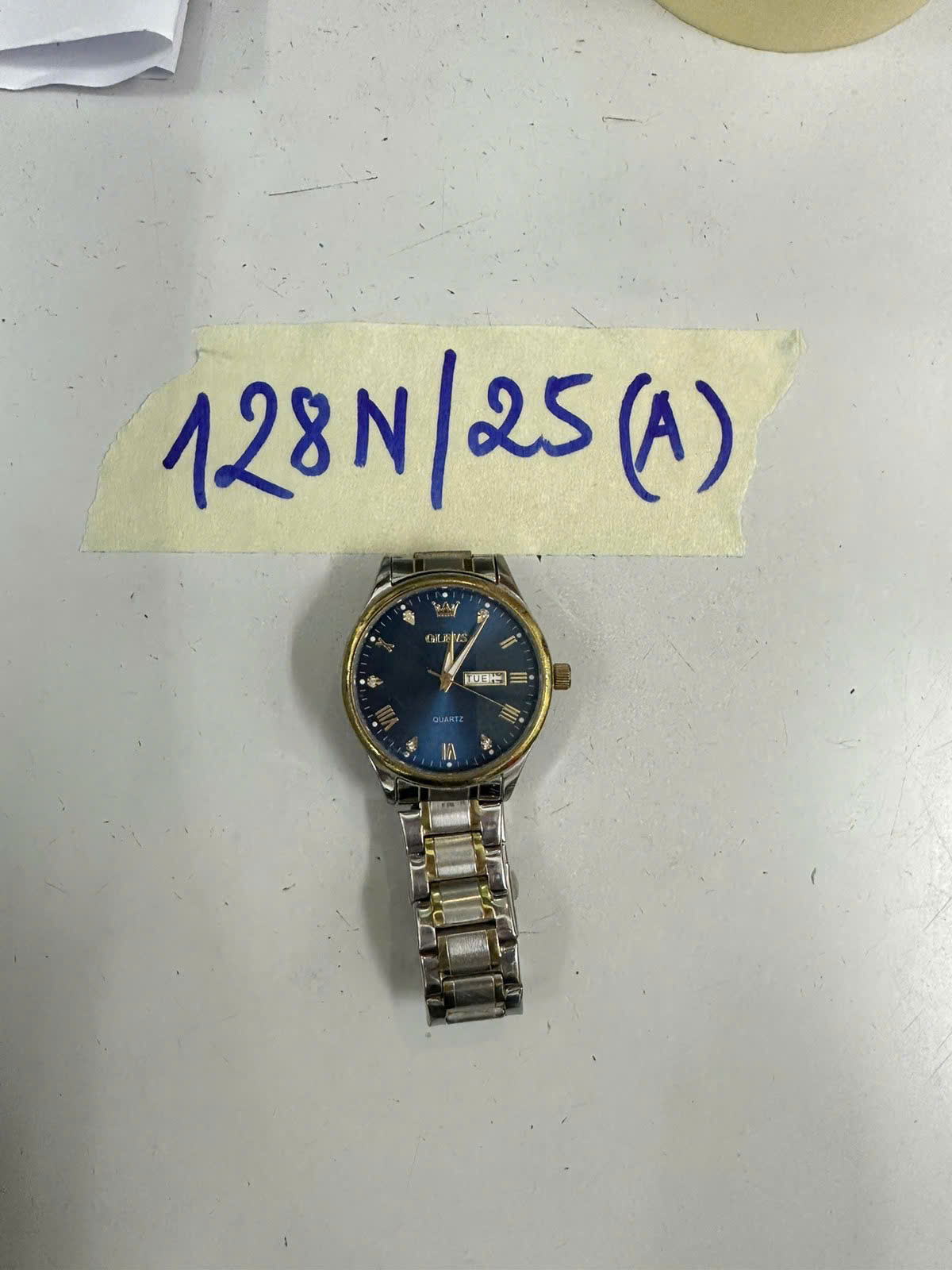 Ngày tiếp nhận: 18/01/2025 Mã hồ sơ: 128N2025A Mô tả: 01 đồng hồ đeo tay kim loại màu trắng, viền kim loại màu vàng, mặt tròn logo chữ OLEVS qua sử dụng. |