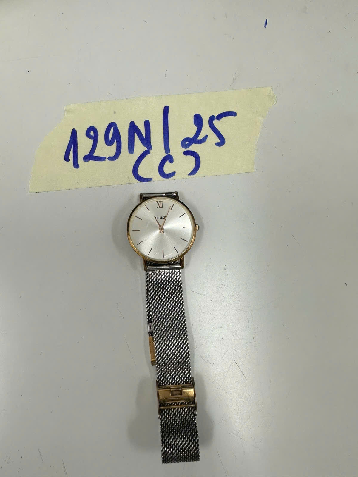 Ngày tiếp nhận: 18/01/2025 Mã hồ sơ: 129N2025C Mô tả: 01 đồng hồ màu vàng có chữ "CT TYSF", dây kim loại màu trắng/ vàng. |