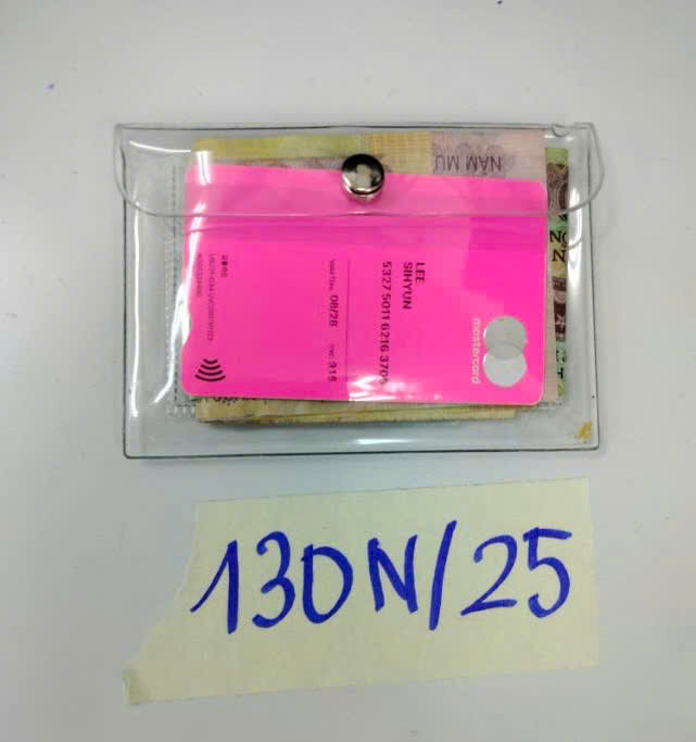 Ngày tiếp nhận: 18/01/2025 Mã hồ sơ: 130N2025 Mô tả: 01 ví nhựa bên trong có 2 thẻ nhựa cùng tên LEE SHIYUN + 112.000VND. |