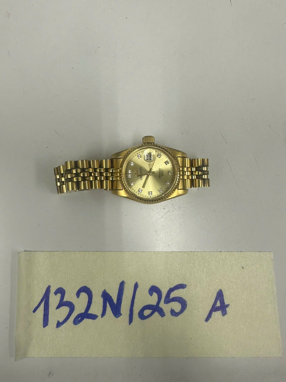 Ngày tiếp nhận: 18/01/2025 Mã hồ sơ: 132N2025A Mô tả: 01 Đồng hồ dây kim loại màu vàng, mặt tròn màu vàng có chữ "ORIENT". |