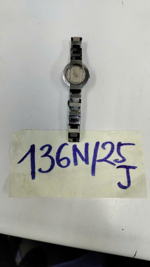 Ngày tiếp nhận: 19/01/2025 Mã hồ sơ: 136N2025J Mô tả: 01 đồng hồ kim loại màu bạc, mặt có chữ “RADO". |
