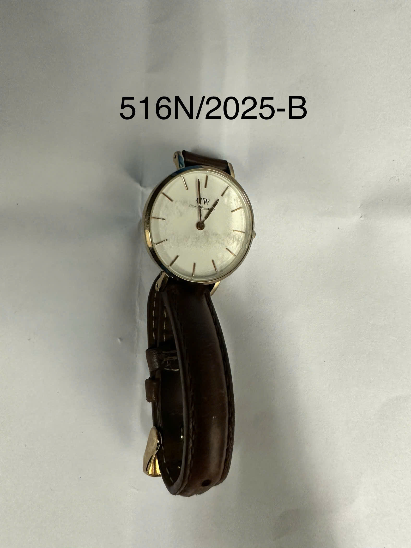 Ngày tiếp nhận: 14/03/2025 Mã hồ sơ: 516N2025B Mô tả: 01 Đồng hồ dây da màu nâu chữ DW. |