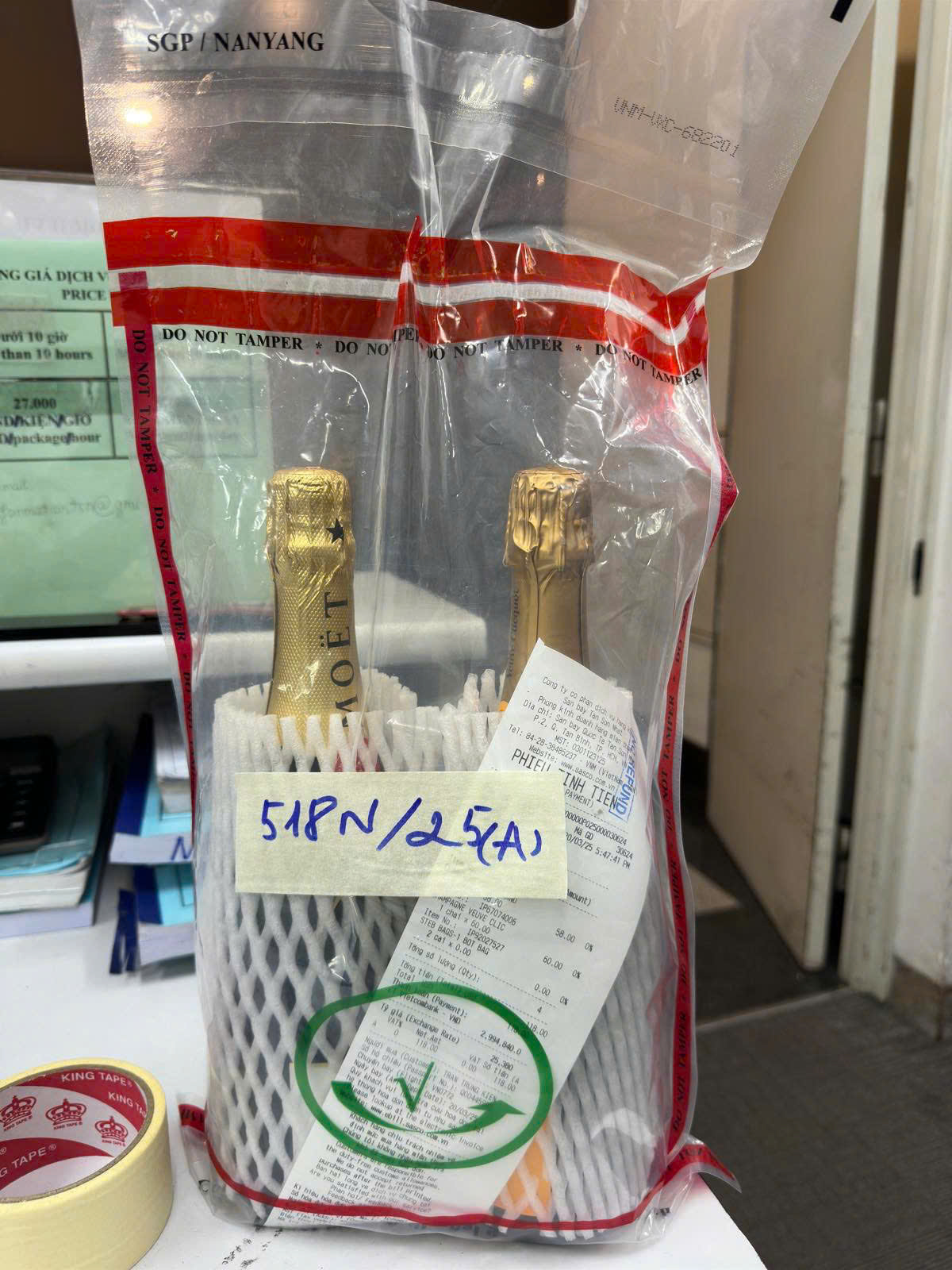 Ngày tiếp nhận: 20/03/2025 Mã hồ sơ: 518N2025A Mô tả: 01 túi nilon seal có 02 chai rượu Duty Moet Champagne. |