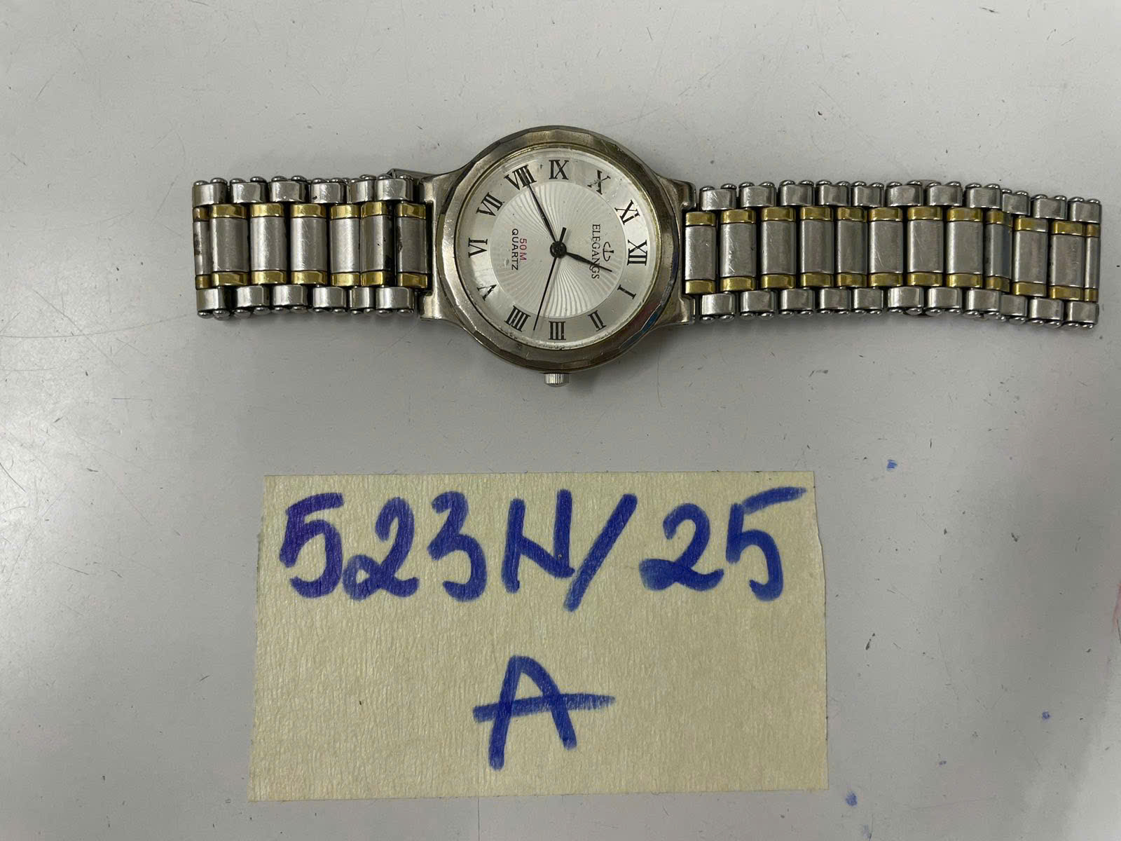 Ngày tiếp nhận: 21/03/2025 Mã hồ sơ: 523N2025A Mô tả: 01 đồng hồ bằng kim loại màu bạc, mặt đồng hồ hình tròn có chữ "ELEGANGS", mặt sau có số M302. |