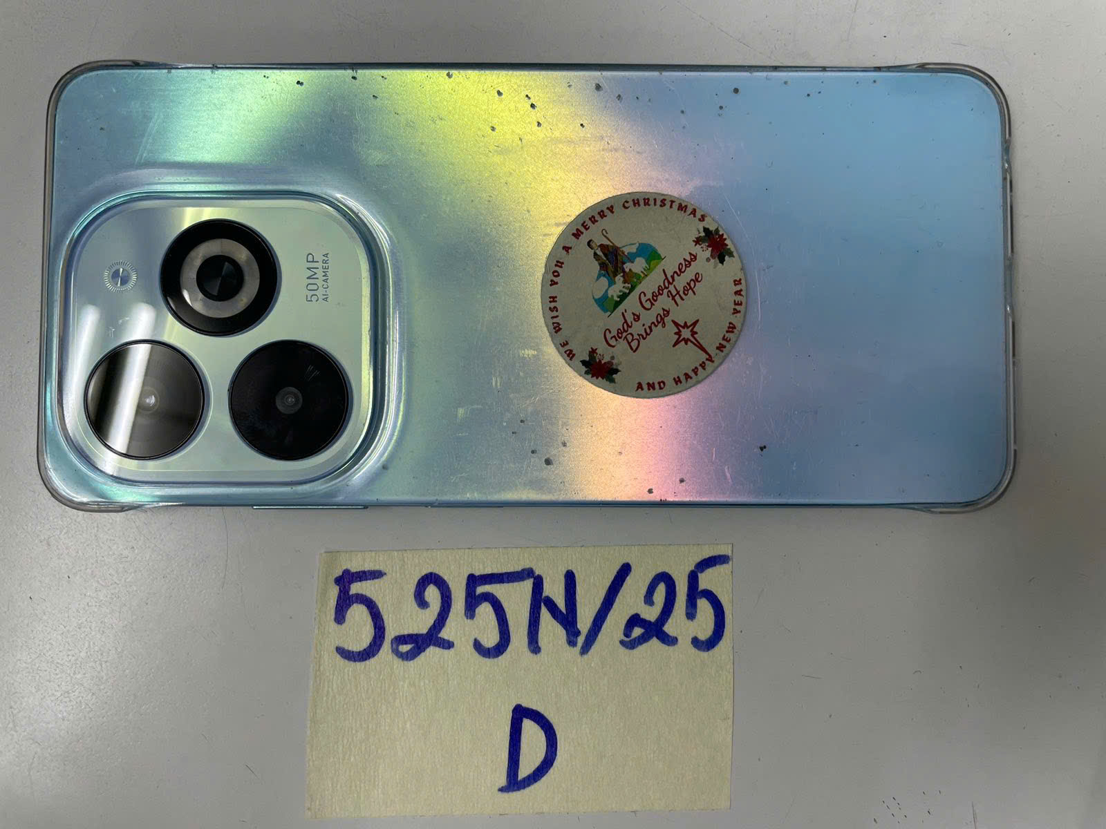 Ngày tiếp nhận: 21/03/2025 Mã hồ sơ: 525N2025D Mô tả: 01 điện thoại màu xanh có chữ "Infinix", ốp lưng nhựa trong. |