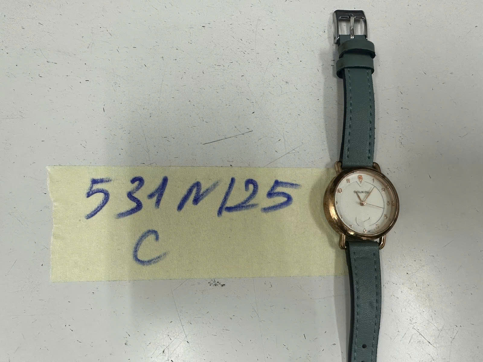 Ngày tiếp nhận: 21/03/2025 Mã hồ sơ: 531N2025C Mô tả: 01 đồng hồ dây da màu xanh, chữ Doukou. |