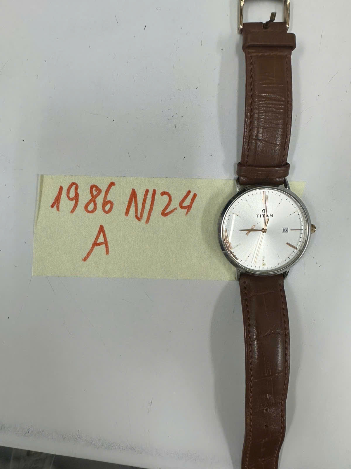 Ngày tiếp nhận: 19/11/2024 Mã hồ sơ: 1986N2024A Mô tả: 01 đồng hồ kim mặt tròn bằng kim loại màu bạc có logo chữ "TITAN", dây đeo màu nâu chất liệu giống da. |