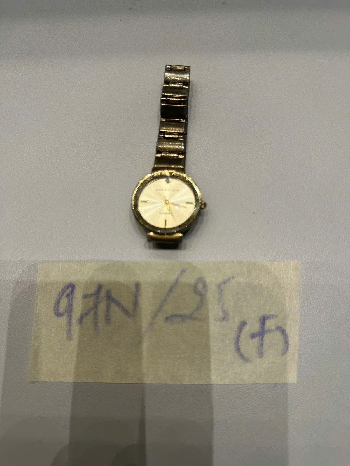 Ngày tiếp nhận: 21/11/2025 Mã hồ sơ: 97N2025F Mô tả: 01 đồng hồ kim loại màu vàng "ANNE KLEIN". |
